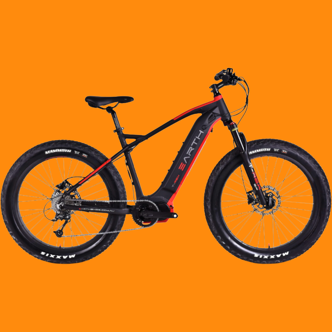 EARTH TREX RINO features include quality brand bike components and powered by NEW EARTH's own ATM Crank Drive 48V mid-mount 100.n.m motor and massive 48V 600WH Samsung lithium-ion battery power pack, one of the largest battery capacities of any branded e-bikes in Australia.