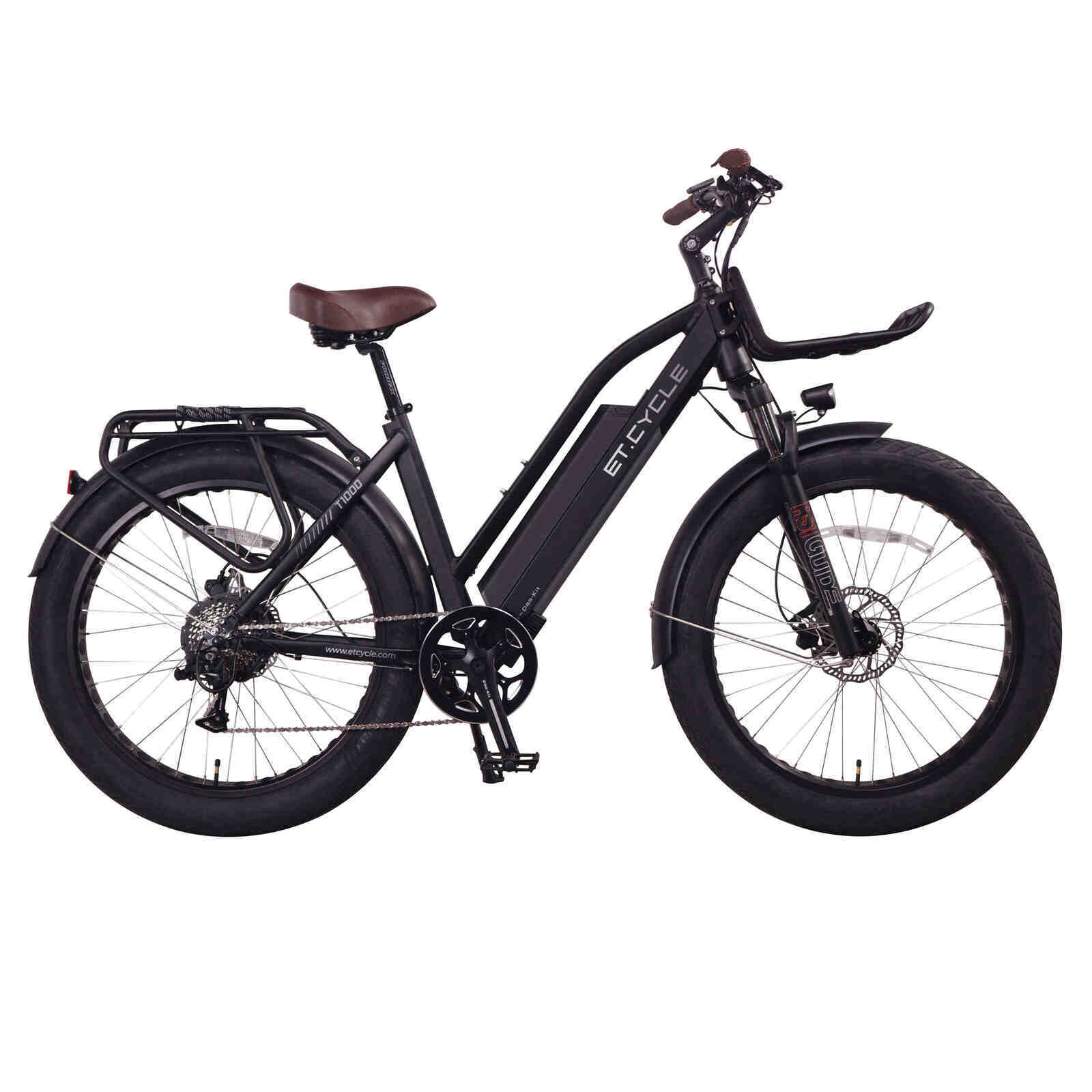 ET.Cycle T-Series is our electric fat bike that pushes attitude even further. Like its F-Series' cousin, T-Series also boasts more power and up to 40% more range with Das-Kit motor and 720Wh Das-Kit battery. But T-Series pushes fat to the max with 26" x 4 inch super fat tires that open up an even wider range of terrain. Deeper sand and snow, more rugged and rutted trails, and rough city streets that other e-bikes might find unforgiving. T-Series's sturdier frame takes more punishment and keeps rolling.
