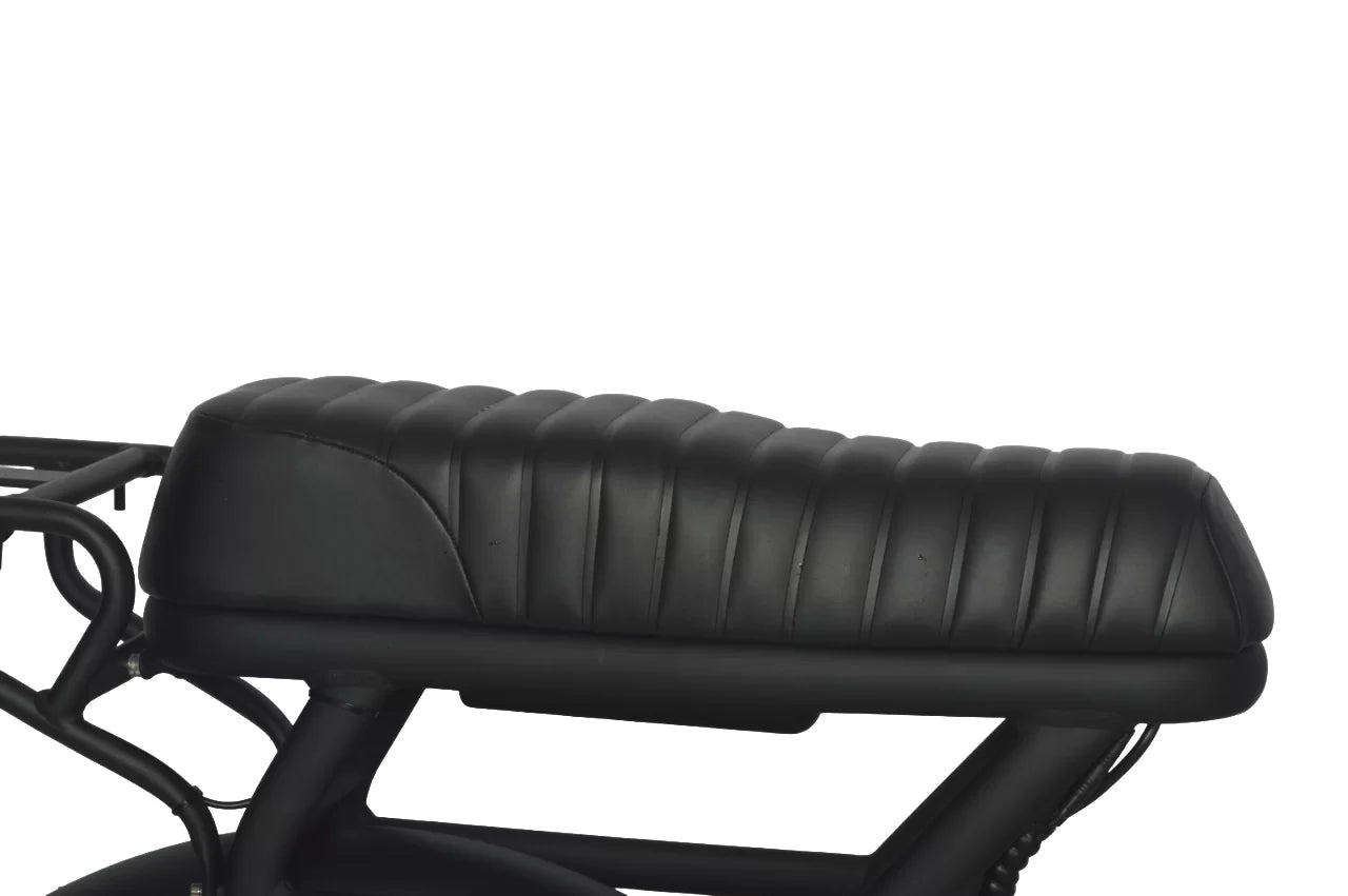 A perfect blend of vintage charm and modern power! With a luxurious Custom Large Black Leather Dual Seat for 2 Riders and matching grips, every detail exudes a timeless style that turns heads wherever you go. But don’t let its classic looks alone fool you: this bike has an edge! With updated specifications, it effortlessly conquers any terrain with superior power and efficiency. Say goodbye to the limits and embrace the exhilarating speed and agility offered by our cutting-edge technology. Enjoy extended rides with the assurance of a robust battery that will keep you going for miles and miles. The unique 20×4′′ tyres not only ensure a smooth and comfortable ride, but also enhance the retro appeal of the bike. Whether you are riding on city streets or venturing off-road, these tyres ensure a secure grip and stability that will allow you to explore new horizons with ease. Rediscover the pleasure of driving in style and unleash your adventurous spirit like never before. It’s time to embrace the future of cycling with a touch of timeless elegance. Thanks to pedal assistance, you can pedal as you please with little or no effort! In addition, we have equipped all our bikes with a 7-speed Shimano gearbox that makes gear changes fast, extremely crisp, precise, and easy to adjust when necessary. With a lightweight aluminium constructed frame, this is a bike that will not only combat rust but you can actually ride it with ease in demanding conditions or in the unlikely event that you run out of charge.